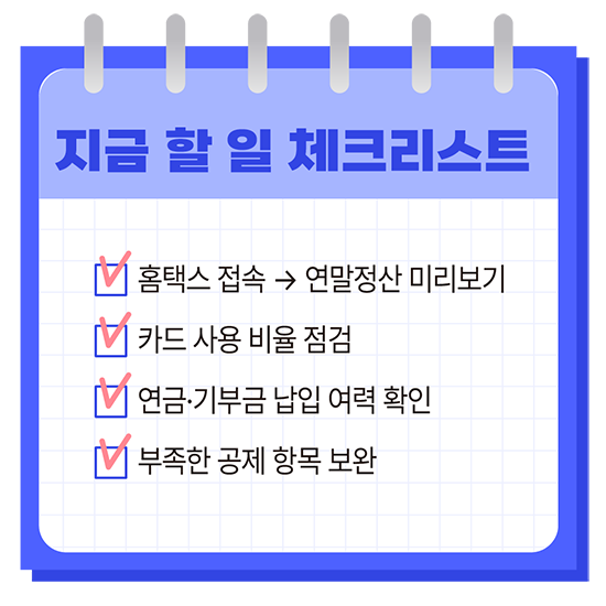 Á÷ÀåÀÎ 5¸í Áß 1¸íÀº ¿¬¸»Á¤»ê¿¡¼ Ãß°¡ ¼¼±ÝÀ» ³»´Â °ÍÀ¸·Î ³ªÅ¸³µ´Ù. ±¹¼¼Ã» ±¹¼¼Åë°èÆ÷Åп¡ µû¸£¸é 2022³â ±Í¼Ó ±Ù·Î¼ÒµæÀÚ 2053¸¸ ¸í Áß 398¸¸ ¸í(19.4%)ÀÌ ¼¼±Ý ȯ¼ö¸¦ Å뺸¹Þ¾Ò´Ù. ÀÌ¿¡ µû¶ó ¿¬¸»Á¤»êÀ» ¾ÕµÎ°í »çÀü ÁغñÀÇ Á߿伺ÀÌ Ä¿Áö°í ÀÖ´Ù. ±¹¼¼Ã» ȨÅýº ¡®¿¬¸»Á¤»ê ¹Ì¸®º¸±â¡¯ ¼ºñ½º¸¦ Ȱ¿ëÇϸé Ä«µå »ç¿ë¾×, ¿¬±ÝÀúÃà, ±âºÎ±Ý µî °øÁ¦ Ç׸ñÀ» Á¡°ËÇØ ¿¹»ó ¼¼¾×À» È®ÀÎÇÒ ¼ö ÀÖ´Ù. ³²Àº ±â°£ Àü·«ÀûÀÎ ¼Òºñ¿Í Àý¼¼ ¼³°è°¡ ¡®13¿ùÀÇ ¿ù±Þ¡¯À» Á¿ìÇÒ Àü¸ÁÀÌ´Ù.